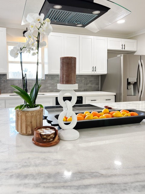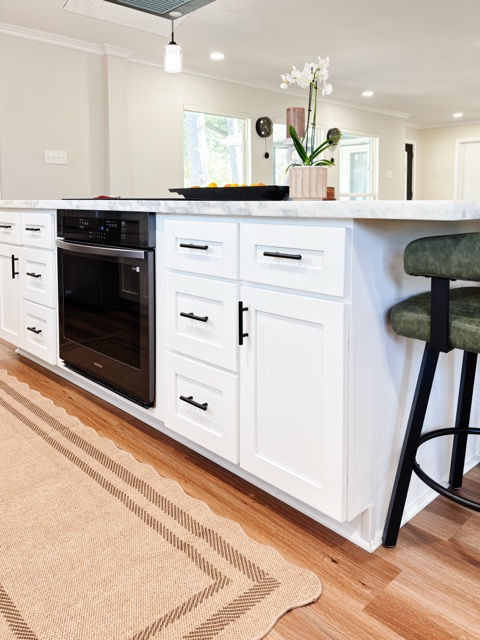 A light, modern kitchen designed with clean lines and subtle contrast. Crisp white cabinetry is softened by warm wood floors and grounded with olive-toned seating, creating a space that feels fresh, functional, and inviting for everyday living and entertaining.